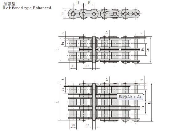 (16ASLR(FQ)-2、16BSLR(FQ)-1、16BSLR(FQ)-2)節距25.40mm、20BSLR(FQ)-2節距31.75mm、(24ASLR(FQ)-2、24BSLR(FQ)-2)節距38.10mm、28ASLR(FQ)-2節距44.45mm