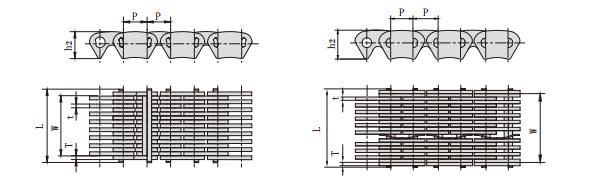滾銷式靜音鏈主要型號有:節距,鏈寬,銷軸長度,鏈板高度,鏈板厚度,導向型式,片數,抗拉強度,每米長重