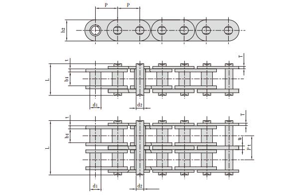 主要型號有:節距,套筒直徑,內節內寬,銷軸直徑,銷軸長度,內鏈板高度,鏈板厚度,排距,抗拉強度,每米長重